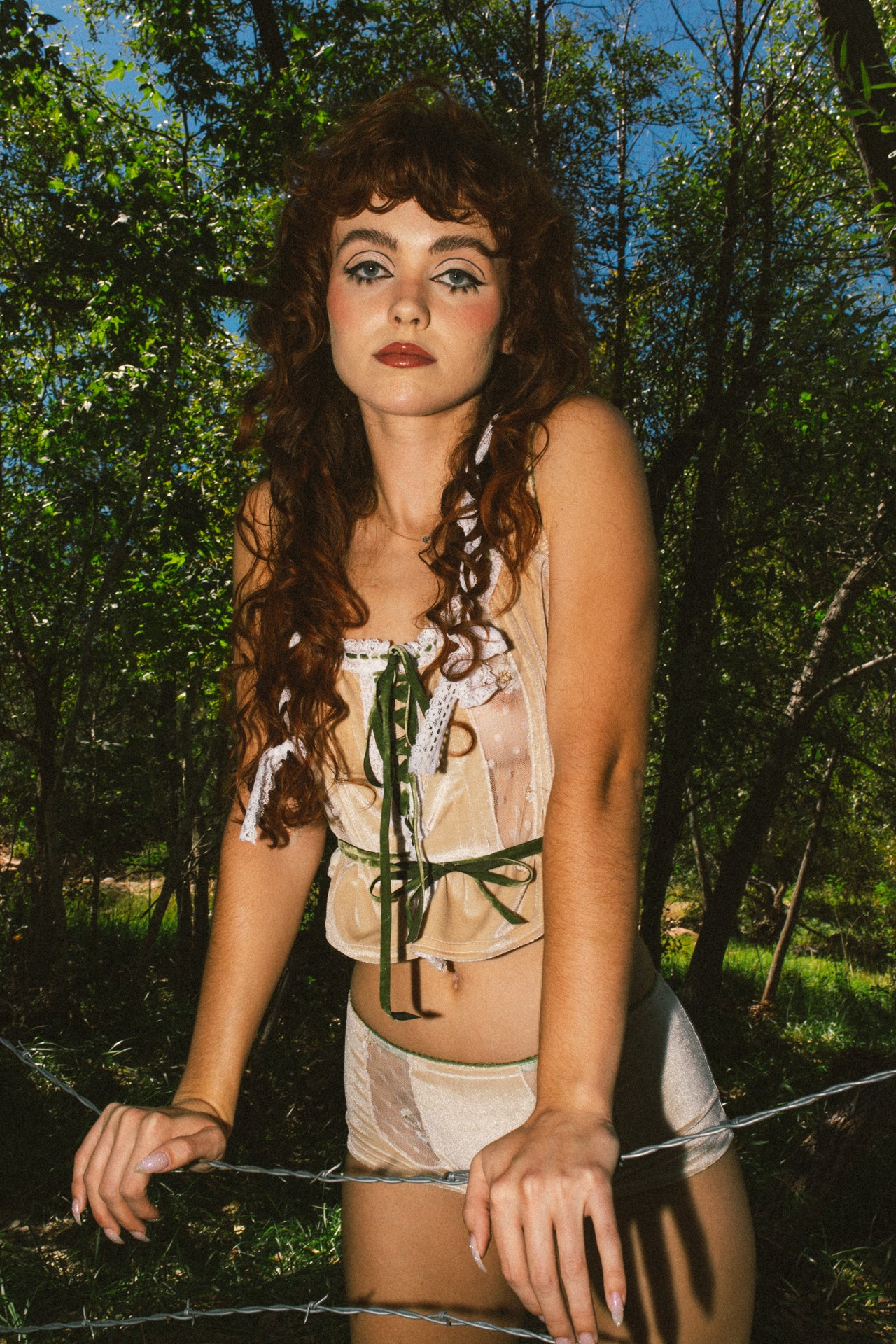 This set will transport you into another world. The set is made in a champagne velvet and lace details. The tank features handmade green velvet lace up bodice and waist tie with lace panels on the front. Set features matching velvet booty cut shorties with the same lace paneling in the front.