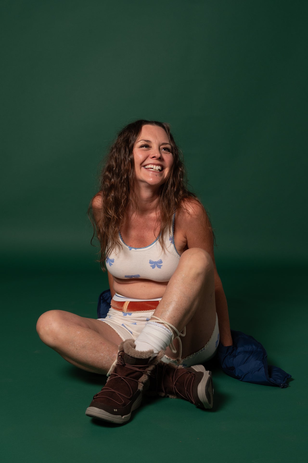 Cropped scoop neck bralette in an ivory with blue bow detailed deadstock material on one side and white ribbed material on the other side. Featuring a thick white elastic band and baby blue trim on scoop. This top can be worn two ways: with either ribbed or thermal in front!