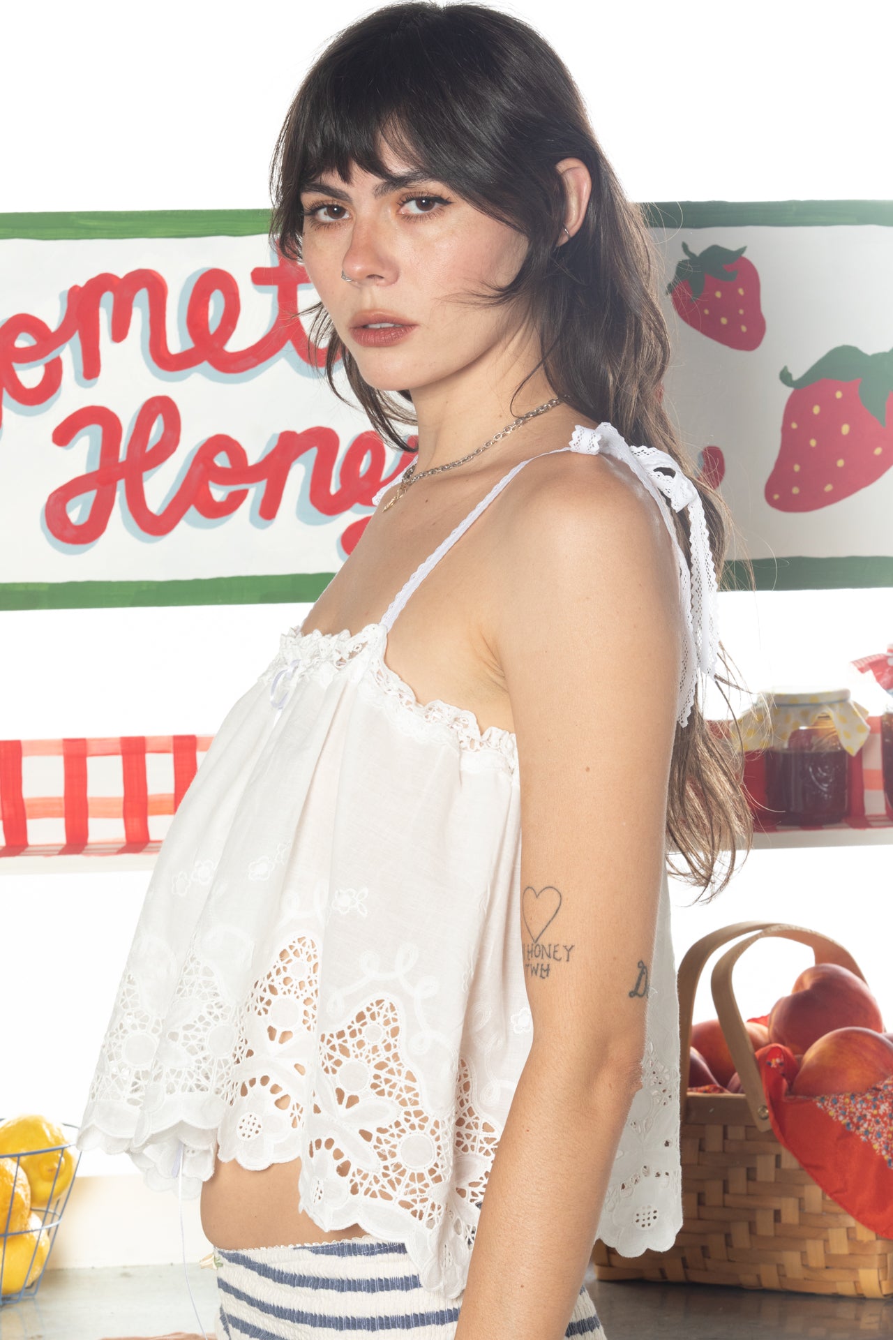 This pristine white woven cotton top features refined eyelet cotton fabric. It is detailed with eyelet trim threaded with ribbon and finished with delicate lace bows on the shoulders.