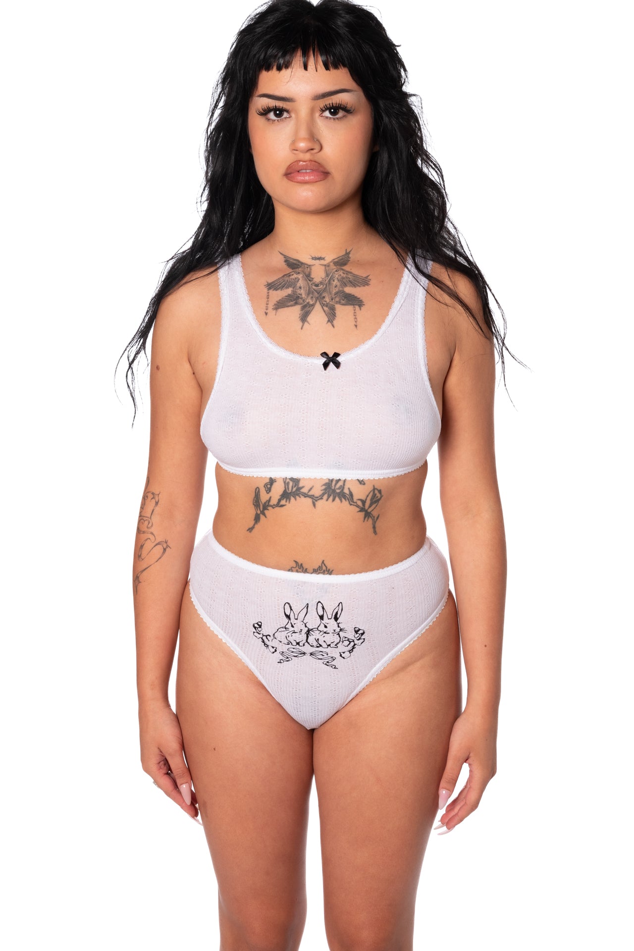Soft white pointelle cotton crop bralette and high waisted thong underwear set. The thong features two hand flocked bunnies in black on the front. Both pieces feature small black bow details.