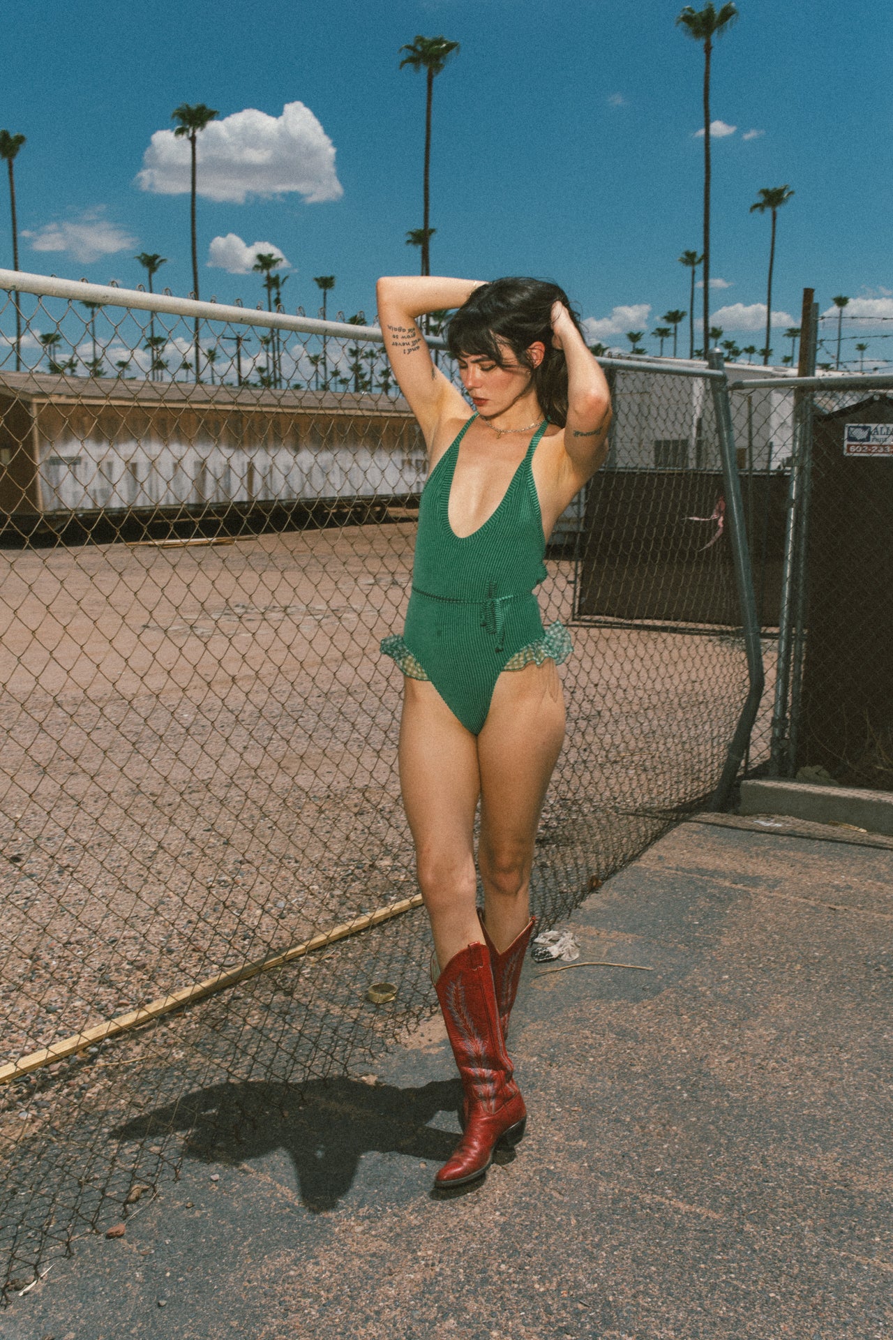 This delightful cheeky bodysuit is made from soft, stretchy deadstock knit fabric in a fresh grassy green shade with a fun crinkle texture. It boasts a v-neckline and a deep scoop back adorned with long pirouette ties. The hips are accented with a playful green gingham ruffle for extra charm.